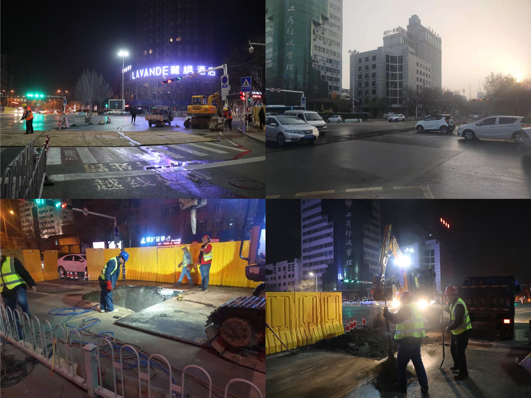由于施工路段為城市主干道,且施工部位位于交叉路口,人員密集、車流量較大,地下線路分布復(fù)雜與城區(qū)地下管網(wǎng)圖紙多處不符,施工中存在諸多難點(diǎn)。公司迅速組建項(xiàng)目專項(xiàng)指揮小組,制定施工方案,實(shí)施錯(cuò)峰作業(yè),集中在夜間施工。在以往道路施工安全管理要求的基礎(chǔ)上,加派專人進(jìn)行夜晚施工期間的交通引導(dǎo),白天鋪設(shè)鋼板,確保交通通暢,并安排專職安全員對(duì)施工區(qū)域內(nèi)鋪設(shè)的鋼板進(jìn)行定時(shí)巡視。施工期間,與沿途各交叉管線的產(chǎn)權(quán)單位溝通協(xié)調(diào)多點(diǎn)地勘,從人工開挖探溝確保沿途各管線線路的安全,到夜間現(xiàn)場(chǎng)管理人員的組織調(diào)度,各項(xiàng)工作有序銜接,穩(wěn)步推進(jìn)。