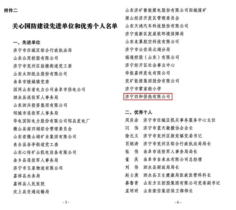 近日,中共濟(jì)寧市委辦公室下發(fā)了《關(guān)心國(guó)防建設(shè)先進(jìn)單位和優(yōu)秀個(gè)人名單》,濟(jì)寧四和供熱有限公司榮獲關(guān)心國(guó)防建設(shè)先進(jìn)單位榮譽(yù)稱(chēng)號(hào)。